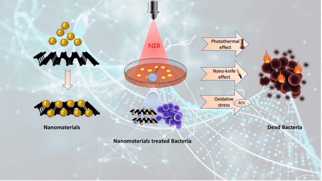 NIR light-sensitive nanomaterials can have the ability of penetrating into bacterial cells and degrading membranes through efficient photothermal activity, enhanced generation of reactive oxygen species (ROS) and also nano-knife effect.